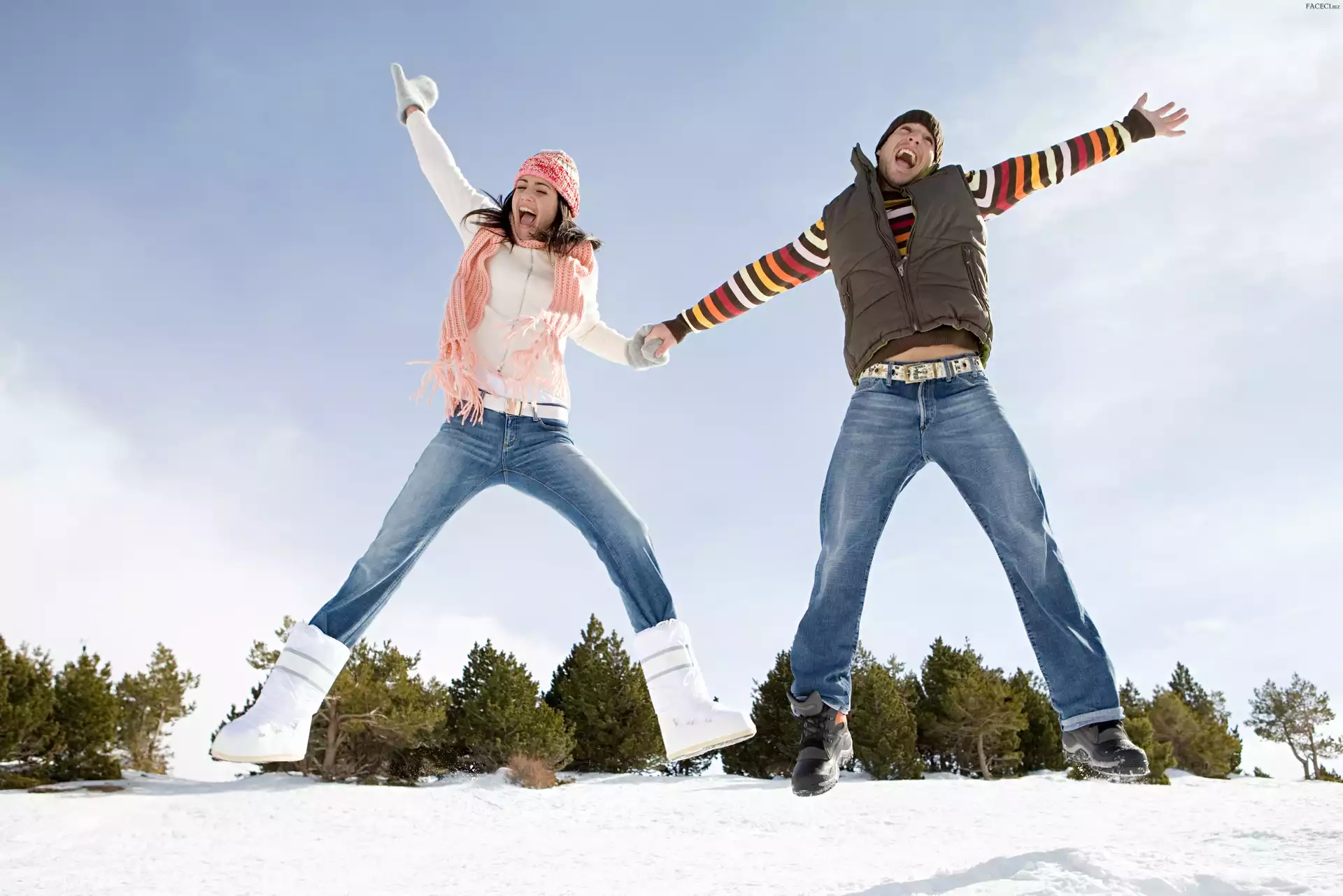 Para, Zima, Niebo, Radość, Śnieg, Drzewa
